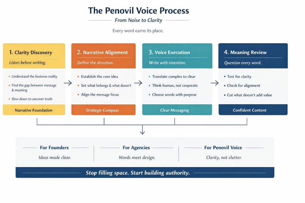 Penovil Voice exists because you are done filling space. We help you say less, mean more, and sound as confident as you actually are.